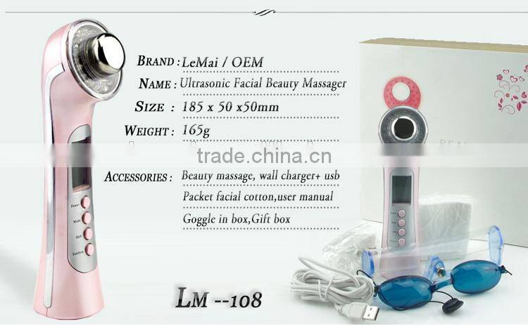 This hot selling product(LM-108) has the 3 most effective & internationally recognized skin care technology: Ion, Photon therapy & Ultrasonic, which enables this generous ultrasonic facial massager to effectively solve following skin problems: spots, black heads, puffiness, eye bags, acne, pimple, ageing of skin etc. Thus helps you keep your skin at the youngest state. It's your Perfect Beauty Salon Equipment at home!