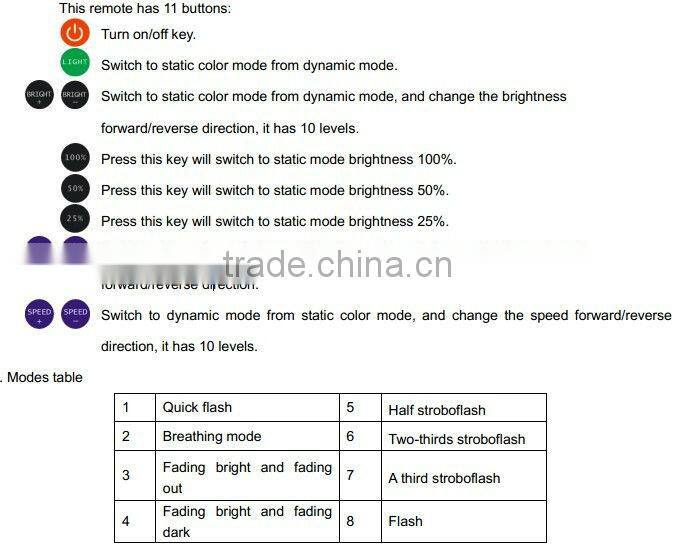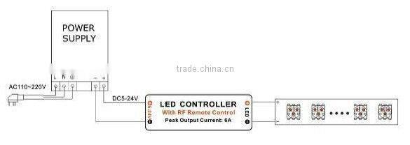 RF controller adopts the advanced micro control unit, with 433MHz wireless signal to do the controlling. It is used for controlling a variety of lamp whose source of light is LED. For instance, point source of light, flexible light strip, wall washer lamp, glass curtain wall light and so on. It has many advantages such as low price, easy connection, simplicity to use and others, etc. According to the customers’ needs, it can realize ten levels brightness adjustment, eight monochromatic dynamic models, and also can realize quick flash, breathing, fadein dimming, strobe, flicker and other kinds of model, with ten levels speed adjustment, large speed span. It is easy to take, simple to use, etc.