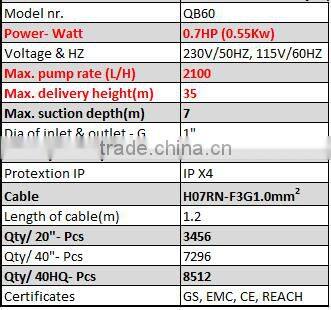 Hot sale 550w QB60 jet pump, cast iron pump, water pump