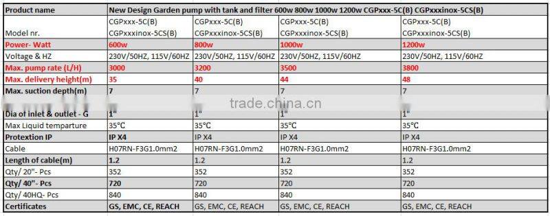 New Design Garden Pump With Tank and Filter 600w 800w 1000w 1200w CGPxxx-5C(B) CGPxxxinox-5CS(B) GS EMC CE ROHS