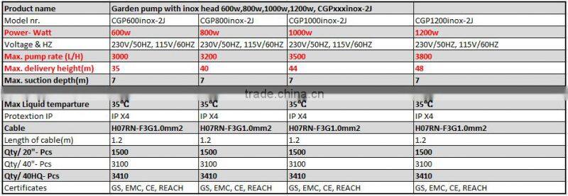Garden Pump With Inox Head 600w,800w,1000w,1200w, CGPxxxinox-2J, GS, EMC, CE, ROHS, REACH, ISO9001, BSCI