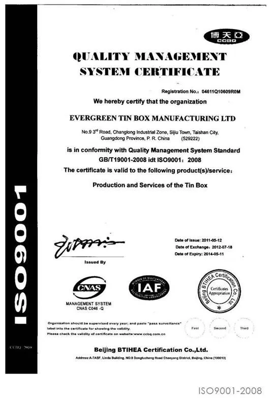 Evergreen is one of the largest tin box manufactures in China/Hong Kong, specializing in all kinds of tin composing of confectionery tins, decorative and fancy tin cans. We are an ISO9001:2008 certified company, and have passed the audits of SA8000, NBC Universal, H&M, BSCI, Sedex, Disney, Coke etc.