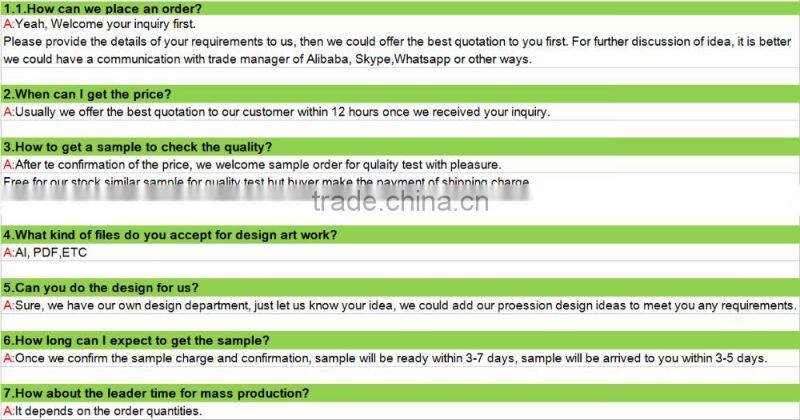 | Sample time | 7-10 days for approval samples after received order deposit/approved artwork/sample charge |