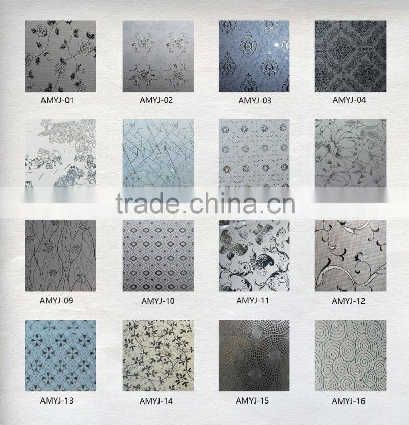 DECORATIVE ART GLASS is produced by acid etching the glass to form various patterns on surface or back of the glass. This product adopt automobile level float glass as raw material,we introduce overseas high accuracy printing equipment, after the silk-screen printing, then Waterborne matte treatment processing , the company independent R&D many patterns, many style flower, facilitate the overseas friends to select and purchase. The product passes through the retreatment in the translucent glass's foundation, which make the glass more attractive , more suitable to household choice.