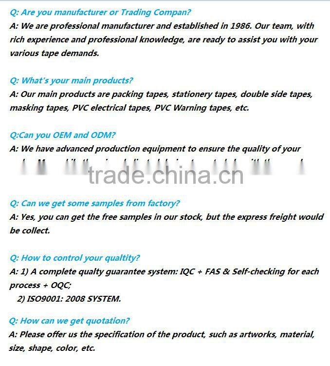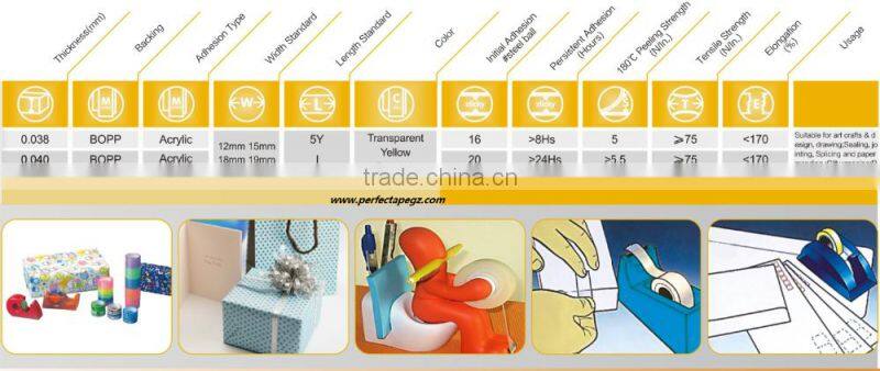 Stationery tape is made with water-based acrylic adhesive coated on Bopp films; Applicable to general sealing, paper mending, fixing & splicing and gift wrapping, Easy-Tear is better and convenient to use without cutting machine at home, office and school. Available in variety of widths, lengths and colors to meet your special requirement.