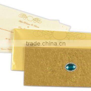 Product Disclosure: Paper: Card front and envelope inner lining on Designer thread finish golden paper. Inside interleaf with pocket and mailing box envelope on perfumed golden shimmery finish paper. 2 Inserts on Cream translucent paper. Printing Color: Silk screen printing