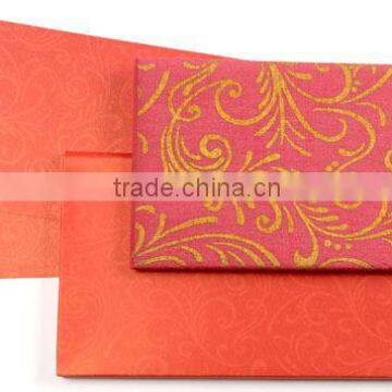 Product Disclosure: A beautiful elegant silk cloth padded card with golden design printed all over the front. The pocket holds the 2 inserts. Mailing envelope has self-pattern as in front printed all over. Paper: Silk cloth for cardboard card; Interleaf, inserts and Mailing box in 250gsm Shimmery finish Hot pink card sheet. Printing Color: Silk screen printing, in Gold.