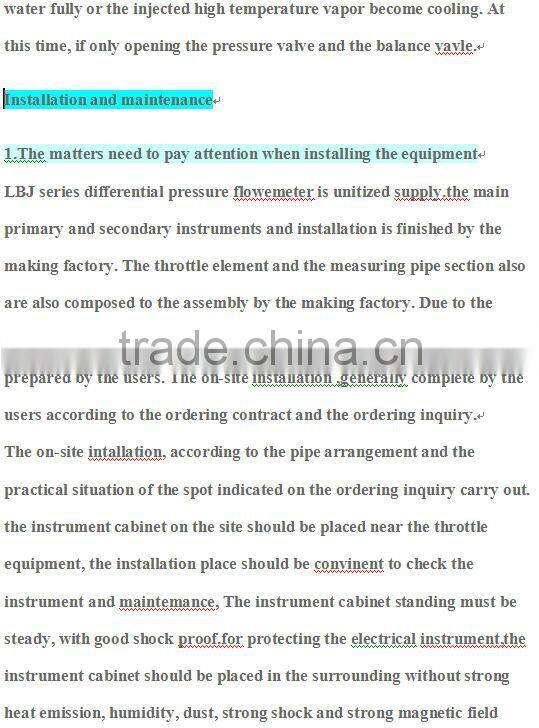 The industrial steam as the secoundary energy are very widely used. It has the very important economic meaning for the accurate measurement of the industrial steam, and also it is the main segment for commencing the energy-saving work. There are a big amount of measuring problems of the industrial stream in the lots of industries, such as oil,chemical, light industry, metallury, textile, food, and medicine etc..Especially the coutry implement central heating policy, which require insistently to settle the problems of the accurate measuring of the large pipe and large flow of the industrial steam. For satisfying the needs of the industrial productioon, our company produce the LBJ series measuring equipments for the big diameter and big flow rate( thereinafter calling equipment), the appliable diameter specifications are Dg50,Dg80,Dg100,Dg150,Dg200,Dg250,Dg300,Dg350,Dg400,Dg450,Dg500,Dg600.