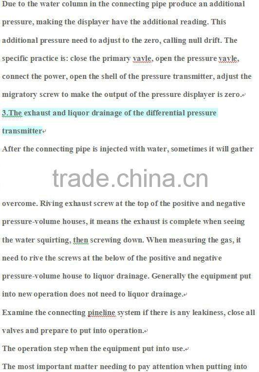 Measuring the high temperature vapor generally transmit the pressure through the cold water. Under the condition that the vapor does not be delivered in the pipeline, open the primary valve, pressure valve and balance valve, close the wash water valve, directly inject the cold water to the drainer by the tender filling hole, until the drainer is full. Of course, it also could close the balance valve and pressure valve, open the primary valve to import high temperature vapor which slowly condense to the water. Due to the too high temperature vapor which could easily damage the instrument, generally it is not adopted. Especially pay attention when measuring the high temperature vapor, the instrument is strictly forbidden to put into work when the connecting pipe is injected fully with water or the temperature is very high. To measure compressed air, cold water directly adopt the measured medium to transmit the pressure.
