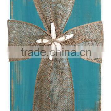 Turquoise and white distressed board with burlap cross is embellished with starfish,seahorse,octopus.