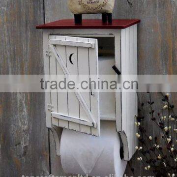 This product is used in toilet, it is made by mdf with distressing finish and can be used it to hold the paper in the toilet, backer metal keyhole is easy for wall hanging
