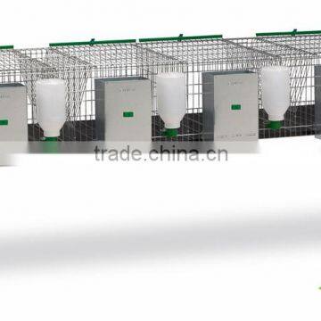 Rabbit cage with 4 compartments for fattening. Comfortable and hygienic plastic floor. Equipped with forage racks, metal hopper feeders with 2 holes and GAUN drinkers with bottles.