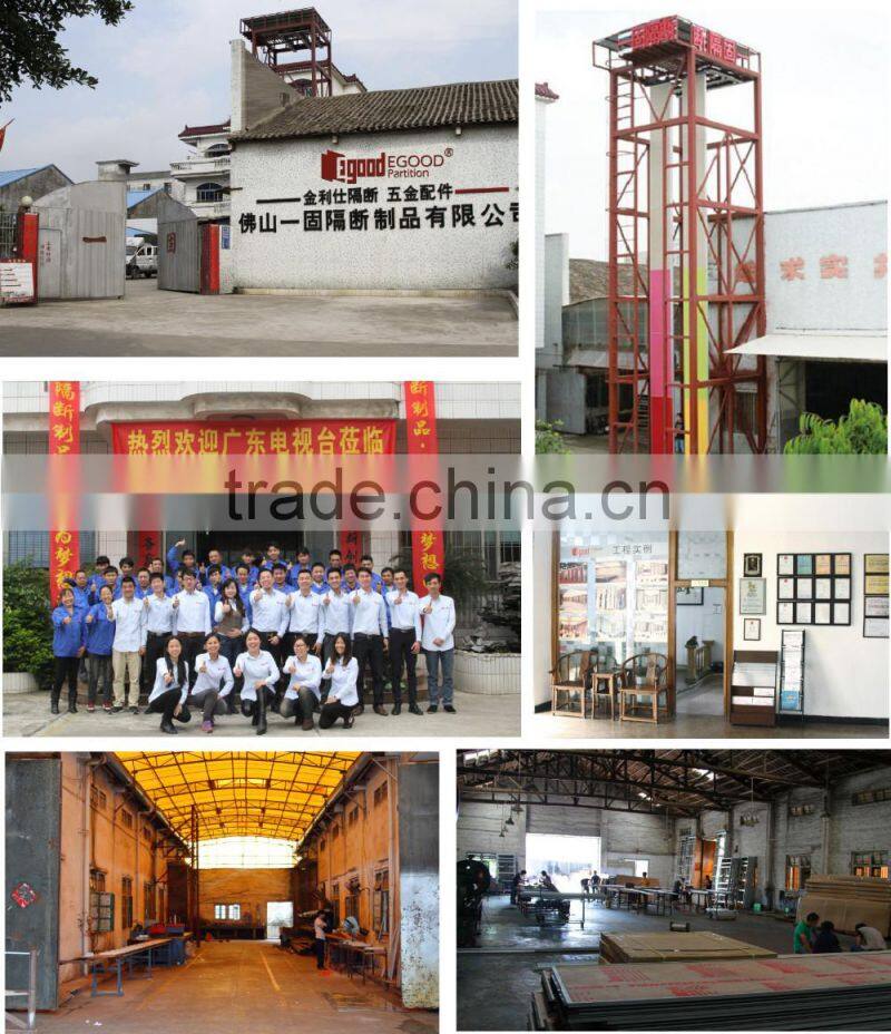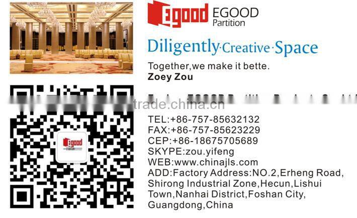 Egood movable wall partition is made of high quality anodized aluminum frame with environmentally composite materials.the panels move on a ceiling track with no requirement of floor guides or rails.,the panel has a standard thickness of 65mm ,80mm and 100mm,and a width up to 1219mm.Maximum height can reach 17meter tall.