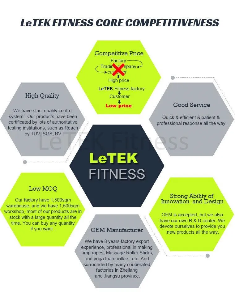 Our factory covers 3,000 square meters with over 60 employees in Yancheng city, Jiangsu province. We have our own molding workshop, sewing workshop, machining workshop with big production capacity for more than 100 varieties of products. The main products are speed jump ropes, massage sticks, resistance exercise bands, etc. variety of cross fit equipment and all kinds of training products.