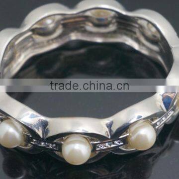Artificial pearl chain hinged closure silver highly polished bangles