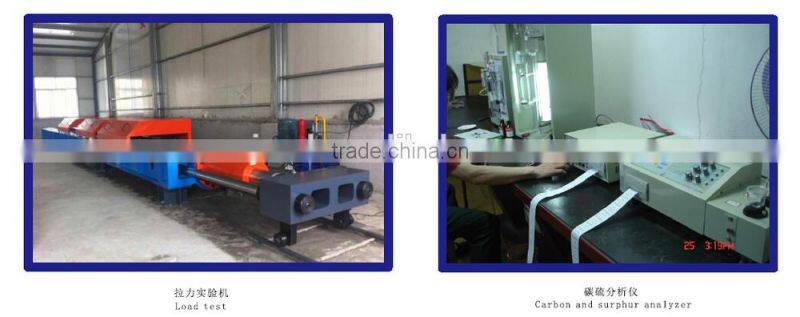 Company has been conducted by Naval Equipment training office in 1998, and esteblished quality control systerm according to National Standard GJB/Z9002-96,GB/T9002. In year 2000, our production have been approved by Chinese New Times Certification Center, which covers from Milltary prodution to civilian shipping production. Company is equiped with No.4, No.5 and No.6 Anchor chain production machine 3 sets, UNT-150,UNT-160 electrical flash welding machine 10 sets, Anchor chain surface polishing machine, 600KN Multi-function material test machine, Intelligentized speed analyser and other inspection facilities in total 28 sets.