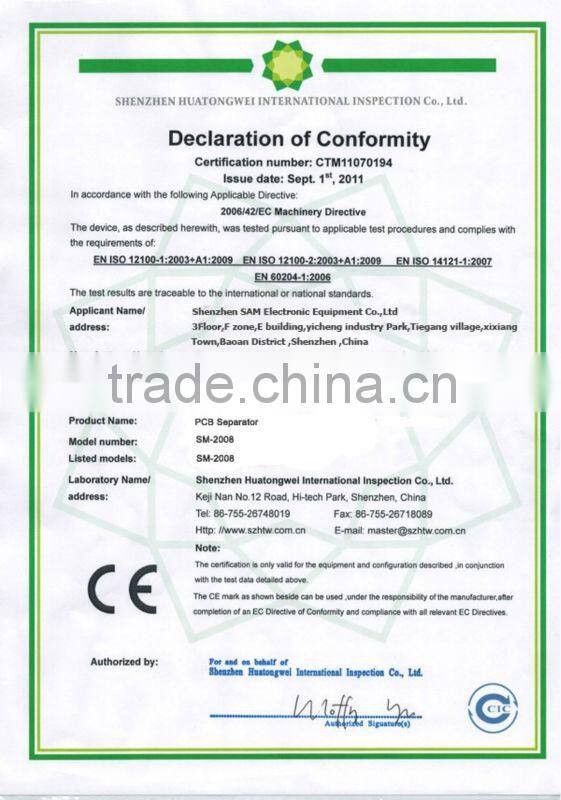 The machine is pneumatically driven and electric control. The straight knife type separator machines were designed to separate pre-scored panel boards carefully, without bending or tension stress. Even