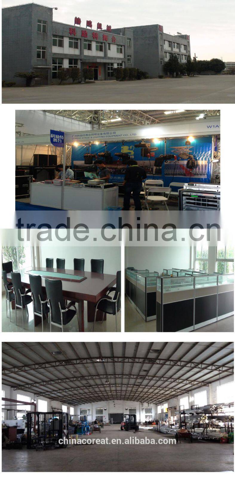 Guangzhou Coreat Stage Equipment Co.,Ltd is a production and sales company that is a member of China Entertainment Technology Association , responsible for production, sales and technical support . With registered trademark ''Coreat" is a company specializd in R&D manufacture, sales and service for modern stage machinery equipment, stage truss, exhibition truss, moblie stage and seating .
