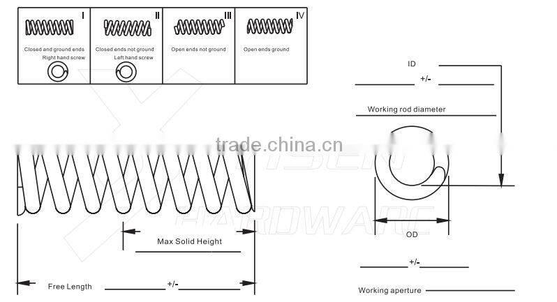 Specified operating conditions of compression spring: operating in the hole or nested in connecting rod. We can ground the ends of compression spring so as to improve perpendicularity and reduce solid height. Sometimes "deflection relieve" of compression spring will be used in the production process to ensure that spring keeps due length under high stress.