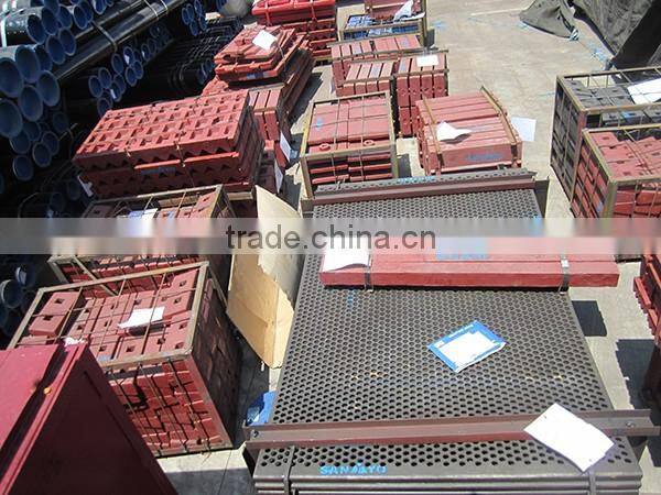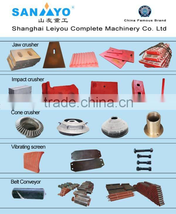Movable jaw plate, fixed jaw plate, side plate and etc for jaw crusher. Impact plates, blow bar and V-belt for impact crusher, screen mesh for vibrating screen, rubber belt, rollers and etc for belt covneyor, blade, runner plates for sand making machines.