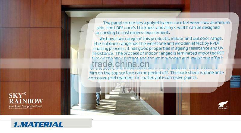 A) Front : aluminium alloy sheet coated with fluoro-carbon resin (PVDF) or polyestor resin(PE) B) Core: nontox low density polyethylene or Firproof core C) Back: aluminium alloy sheet coated with polyester resin painting D) Surface coating thickness: 38μ±1μ in four coating E) Aluminium alloy: 3003 H24 F) Sheet thickness: 0.21mm,0.3mm,0.4mm,0.5mm |