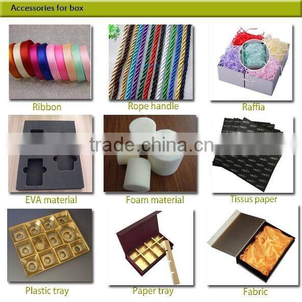 Material available | Greyboard(650gsm, 950gsm,1250gsm,and so on) Coated paper (128gsm,157gsm,210gsm,300gsm,350gsm) Art paper(usual 110gsm) Kraft paper(120gsm,130gsm,150gsm) Gold foil paper Corrugated paper Papercard(210gsm,300gsm,350gsm ,450gsm) |