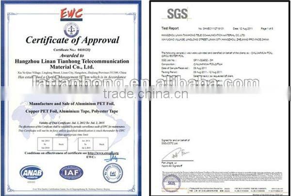 Hangzhou Lin’an Tianhong Telecommunication Material Co.,Ltd., founded in 2000,is an enterprise specialized in producing and exporting raw materials for refrigeration industry ,flexible duct, electric wires and cables, and optional cables, such as aluminum foil Mylar tape , Metallized PET, PVC tape, and copper foil Mylar tape ,polyester tape(PET) tape, aluminum-plastic tape ,aluminum tape, and so on. Being in these lines for more than 15 years, the company has been well received by the clients’ satisfaction and recognition. Your requirements is our goal, and your satisfaction is our carving. We has already invested 10lines which machines are imported from Germany,and we are preparing for our second phase. Also we have managed by ISO9001:2000 quality management systerm and all of products come with RoHS certification.