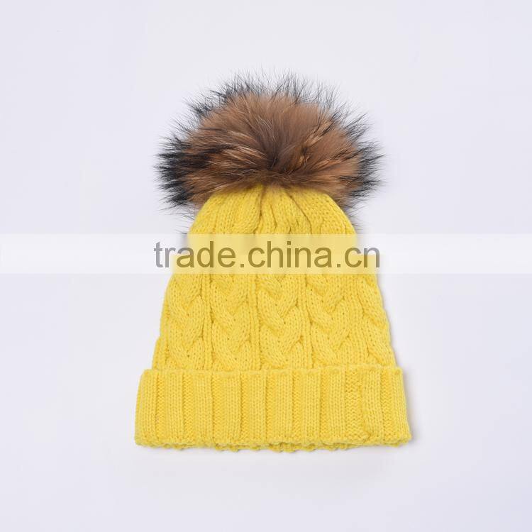 Bright Yellow Knitting Beanie Hats With Big Fur Pompoms for Winter Warm KZ160075