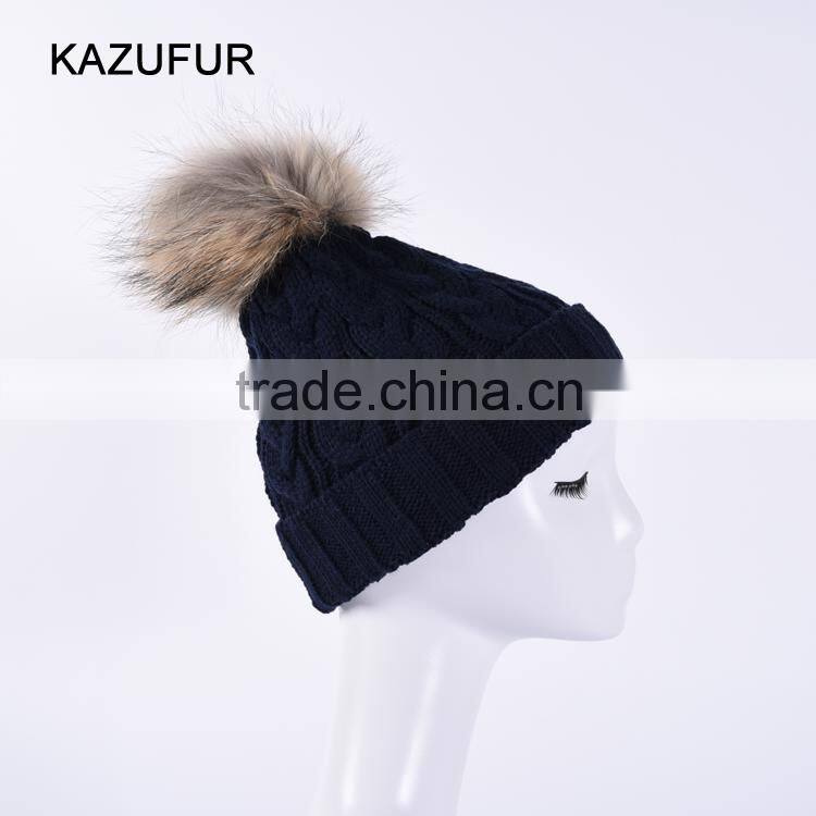 Daily Life Winter Fur Hat Wool Knitted Beanie Hat With Fur Pompoms on Top KZ160075 NAVY