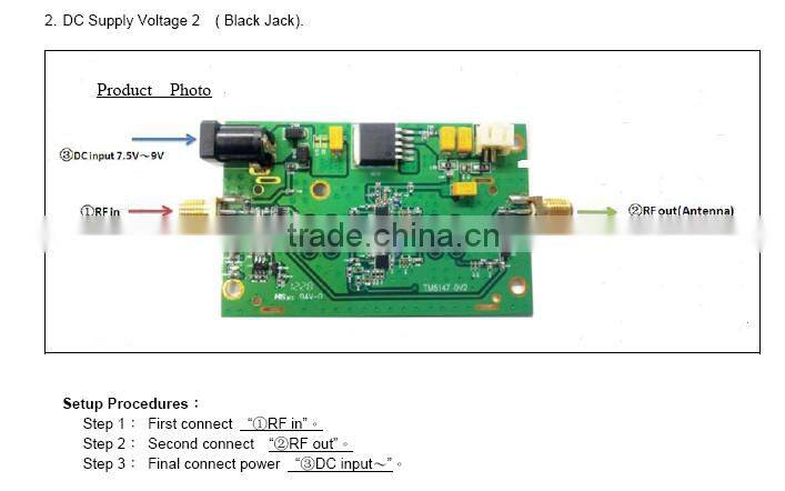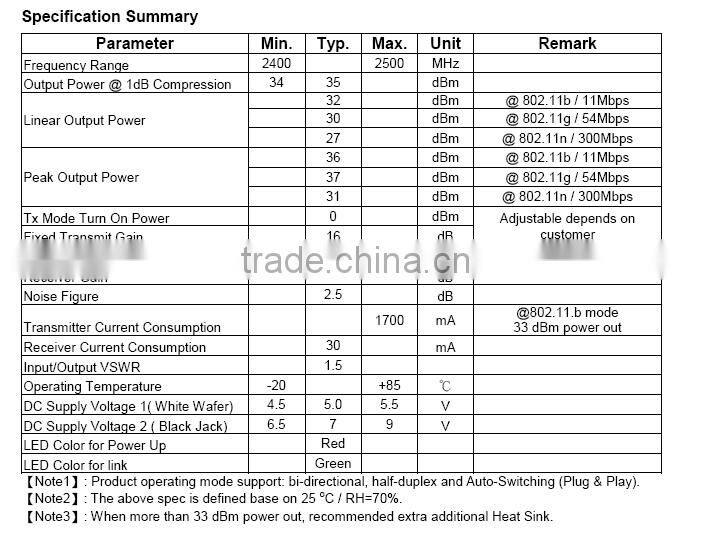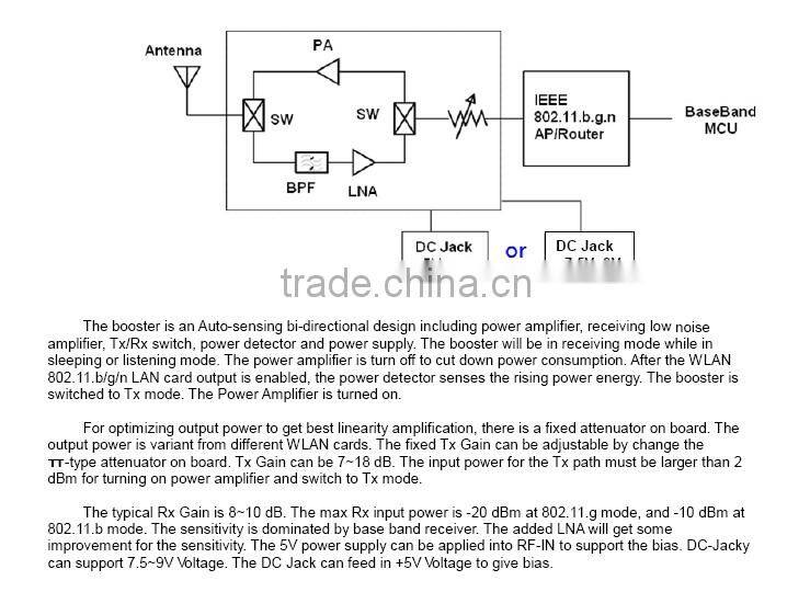 The TM5147 is a bi-directional booster designed to extend the range of wireless radio devices which require high linearity amplification. The unit is effective as used with 802.11n application. TM5147 provides transmit gain and low-noise receive gain to increase the range and compensate the cable loss in installation.