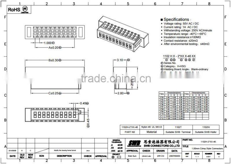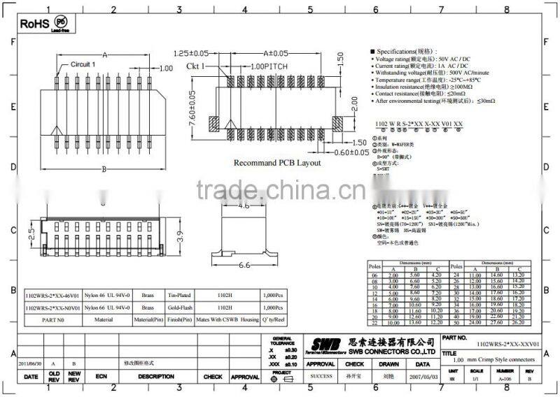 1.00mm Pitch 20pin Lvds Connectors With Pcb Wire to Board Connector