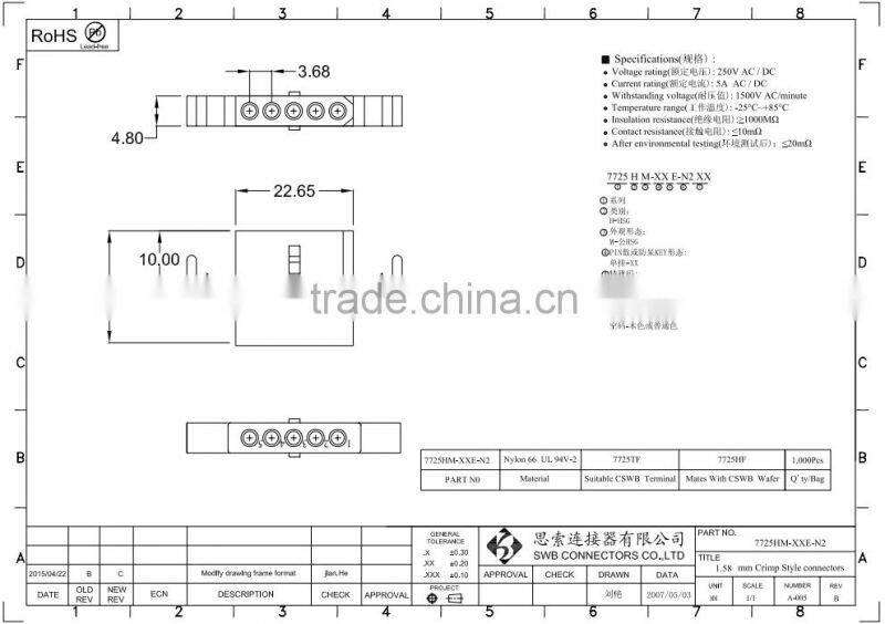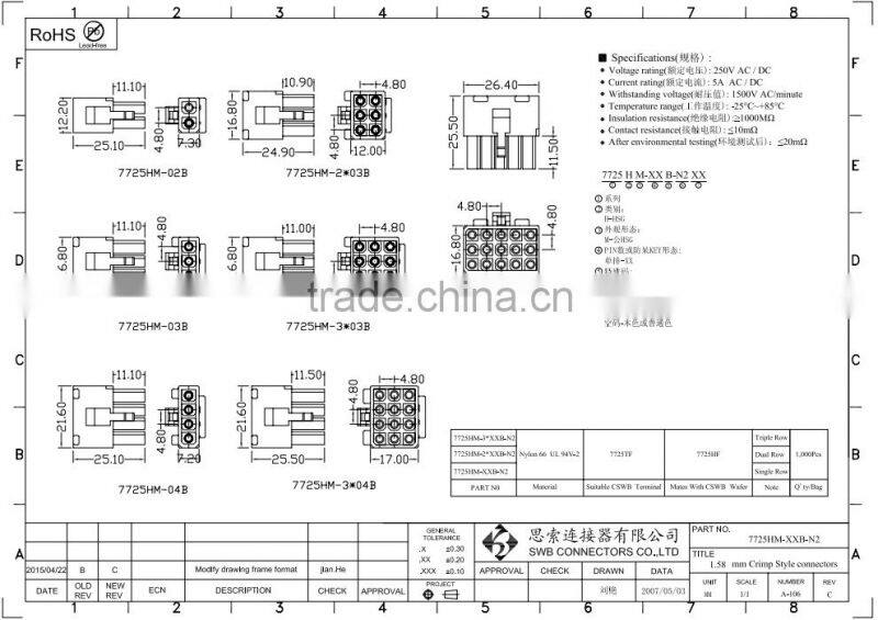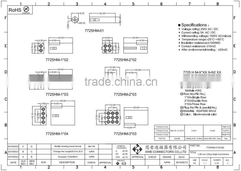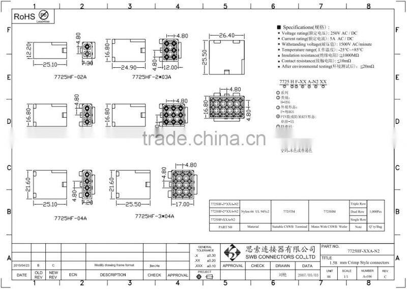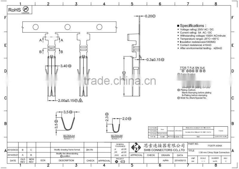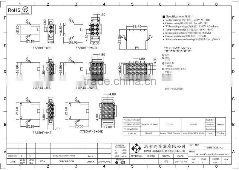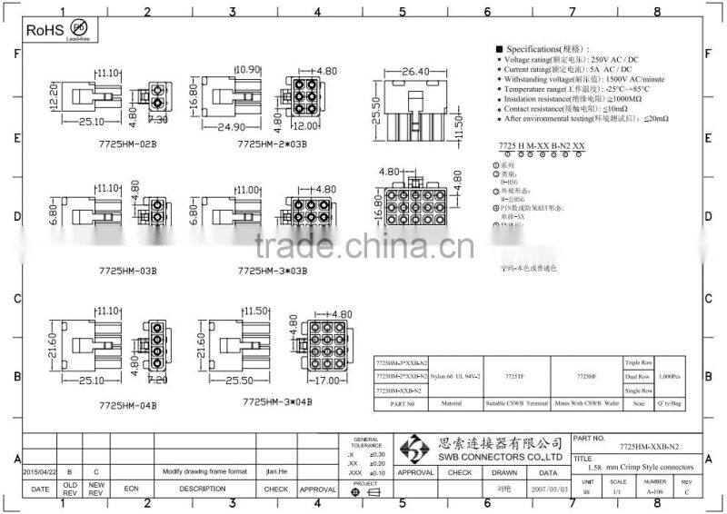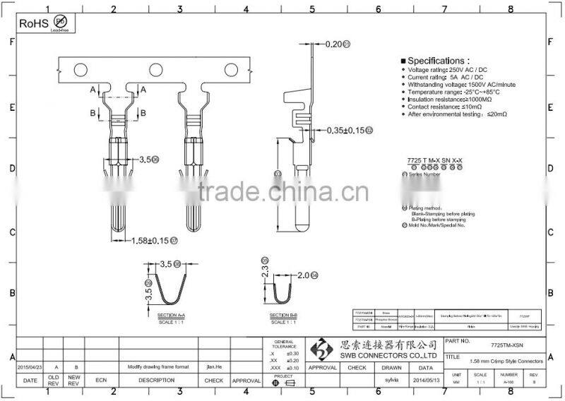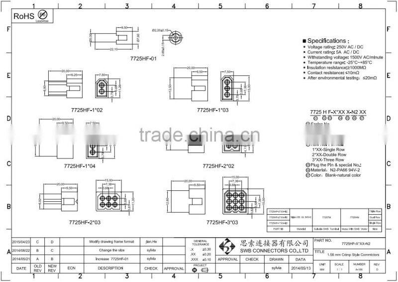 1.58mm Pitch Wire to Wire Connectors Crimp Electrical Terminals Automotive Connectors