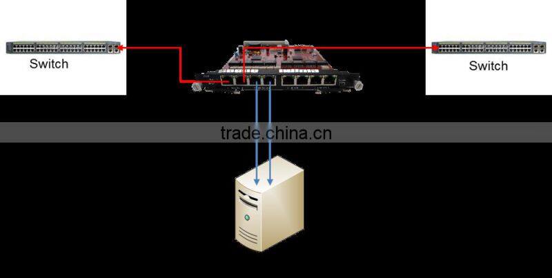 There are 8 ports for OEO6500-GTAP, which realizes network ports access links to be monitored in cascade connection, as well as monitoring ports access to monitoring equipment. Mirror ports are designed with separated transmission in the upstream and downstream directions. That is, the data input to Network Port A will be copied and output to Monitoring Port A; the data input to Network Port B will be copied and output to Monitoring Port B.