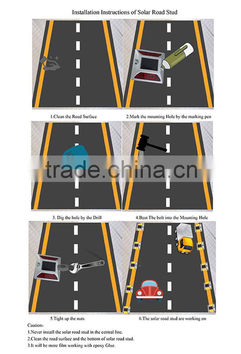 3.Stick with glue:using the proper quantity glue,sticked on the ground firm ,after installation, please turn the road stud left and right once again to ensure the road studs paste on the road uniform