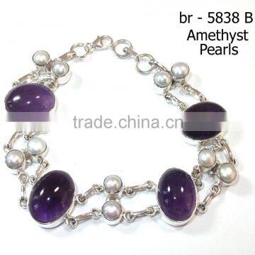 Amethyst Gemstone Pearl Bracelet Solid 925 Sterling Silver Jewelry