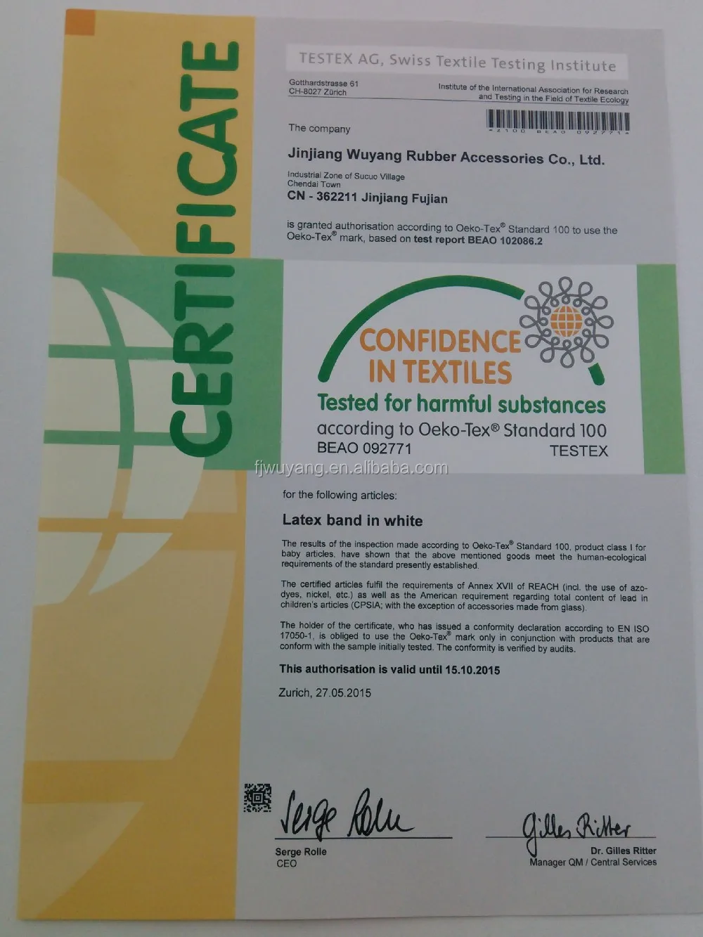 We have been granted authorisation according to Oeko-Tex Standard 100 to use the Oeko-Tex mark,base on test report BEAO 102086.2.