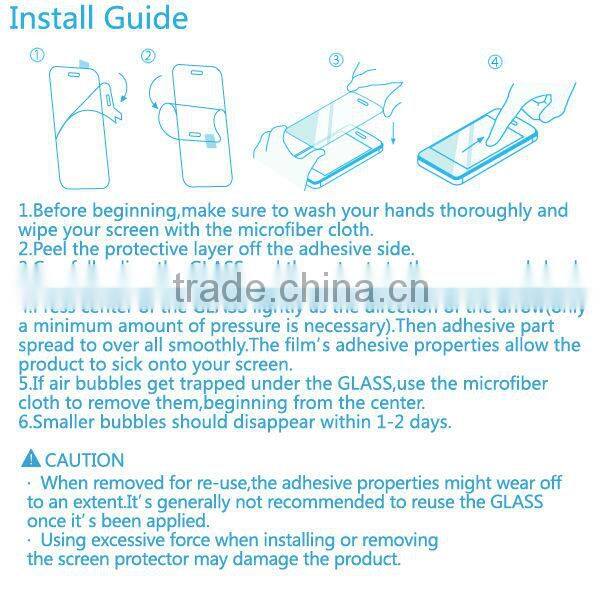 Features  | 1. 9H anti-scratch, anti-oil, anti-fingerprint, anti-UV, and anti-static. 2.Thickness:0.33mm 3.Transparency:99% 4.Shatter proof while hammer or drop 5. Bubble free, easily to be applied do it yourself.  |