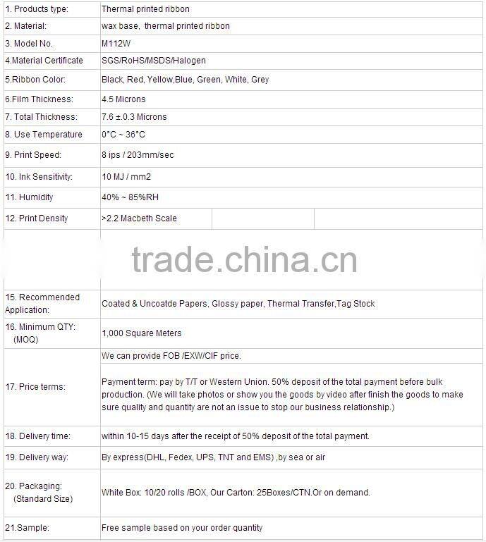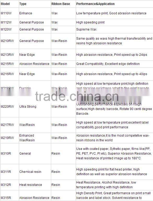 CrystalCode thermal printed ribbon is suitable for all popular Barcode Label Printers, suitable for flat head printers as well as near edge printers. We provide WAX, WAX/RESIN, RESIN and typical types. Like M110W with Enhanced wax, M210RW with Geeral Purpose wax/resin, M216RW with Near Edge wax/resin, M310R Durable Resin are populars. Excellent backcoating reduce static and prolong printhead life and makes the heat resistance print performance well. We can also produce custom ribbon sizes to specifically meet your needs.