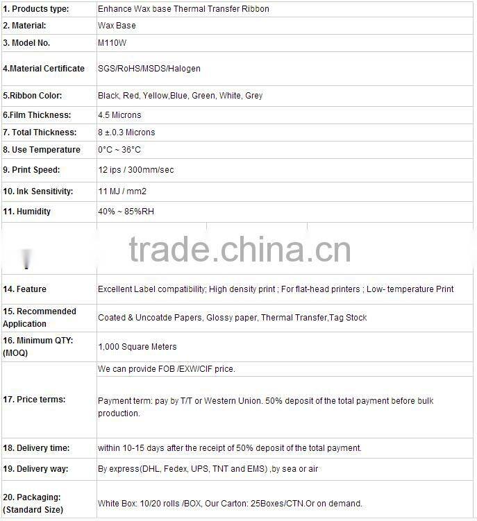 Product Name: High quality barcode printer ink in wax base ribbon