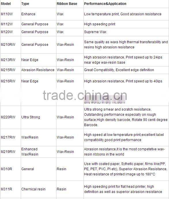 CrystalCode Thermal Transfer Ribbon is suitable for all popular Barcode Label Printers, suitable for flat head printers as well as near edge printers. We provide WAX, WAX/RESIN, RESIN and typical types. Like M110W with Enhanced wax, M210RW with Geeral Purpose wax/resin, M216RW with Near Edge wax/resin, M310R Durable Resin are populars. Excellent backcoating reduce static and prolong printhead life and makes the heat resistance print performance well. We can also produce custom ribbon sizes to specifically meet your needs.