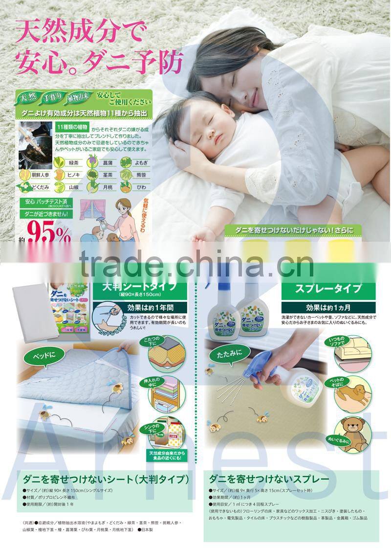 It is effective to place Mite Killer Sheet on places that mites are likely to stay. Since this sheet is made from natural plant ingredistents, it is safe for everyone including kids. Mite Killer Sheet has an effect on for about 1 year.