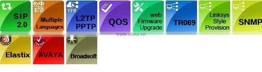 | Protocols | SIP V2 (RFC 3261,3262,3263,3264) Backward Compatible with RFC2543 Session Timer (RFC4028) SDP (RFC2327) RTP/RTCP (RFC1889 and RFC1890) NAPTR for SIP URI Lookup (RFC2915) STUN (RFC 3489) ARP/RARP (RFC 826/903) SNTP (RFC 2030) DHCP/PPPoE PPTP/L2TP VPN HTTP Server for Web Management TFTP/HTTP/HTTPS for Auto Provisioning DNS/DNS SRV (RFC1706 and RFC 2782) |