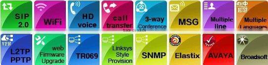 4 lines, Auto Answer, 3-way Conference, Music on hold Call Hold, Call Forwarding. Call Mute, Call Transfer, Call Waiting, Call Pickup MWI, CID and CWCID, Full-duplex Speakerphone, Delayed Hotline DTMF Relay: In-band, Out-band(RFC2833) and SIP Info Redial, Dial Plan, Volume Adjustment, Handset/Headset, Speaker and Ringer |