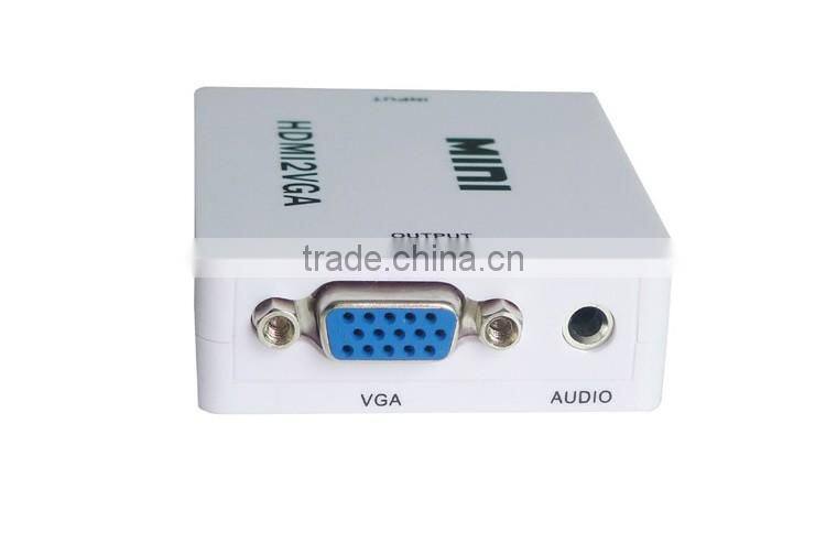 The MINI HDMI2VGA is a high-definition video converter which convert HDMI digital signal to VGA analog signal and analog audio signal. HDMI signals connection PS3, XBOX360, Blu-ray DVD, HD set-top boxes, CRT / LED Display ect. You can easy to watch HD Video on the normal TV which without HDMI Interface.