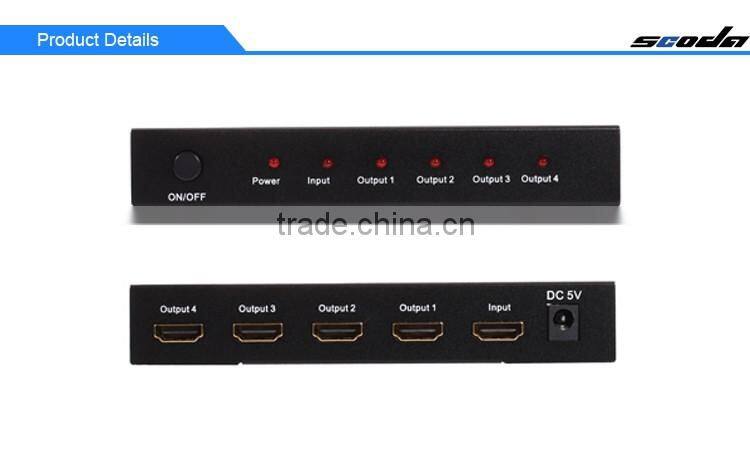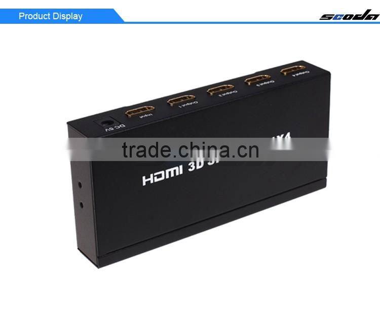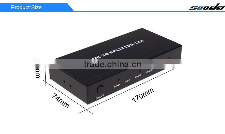 1 × 4 HDMI splitter distributes 1 HDMI source to 4 HDMI displays simultaneously. It offers HD video solution for super market ; shopping mall ; HDTV, STB, DVD , projector factory; data control center; information distribution; conference room presentation; education and training ; corporation show room ; home theater , etc.