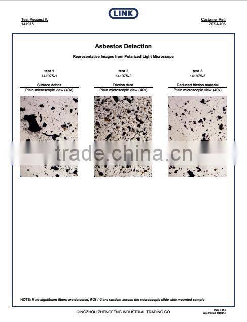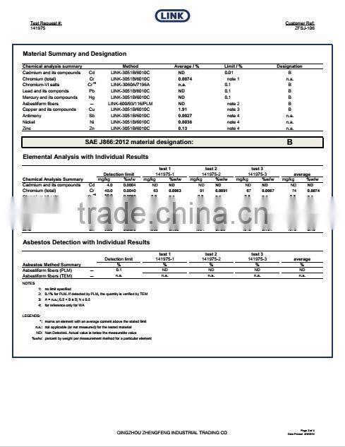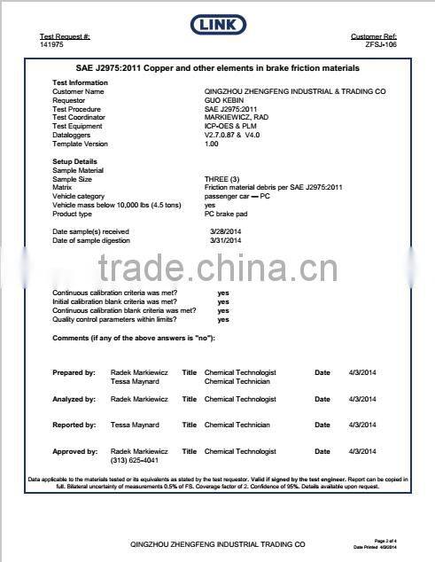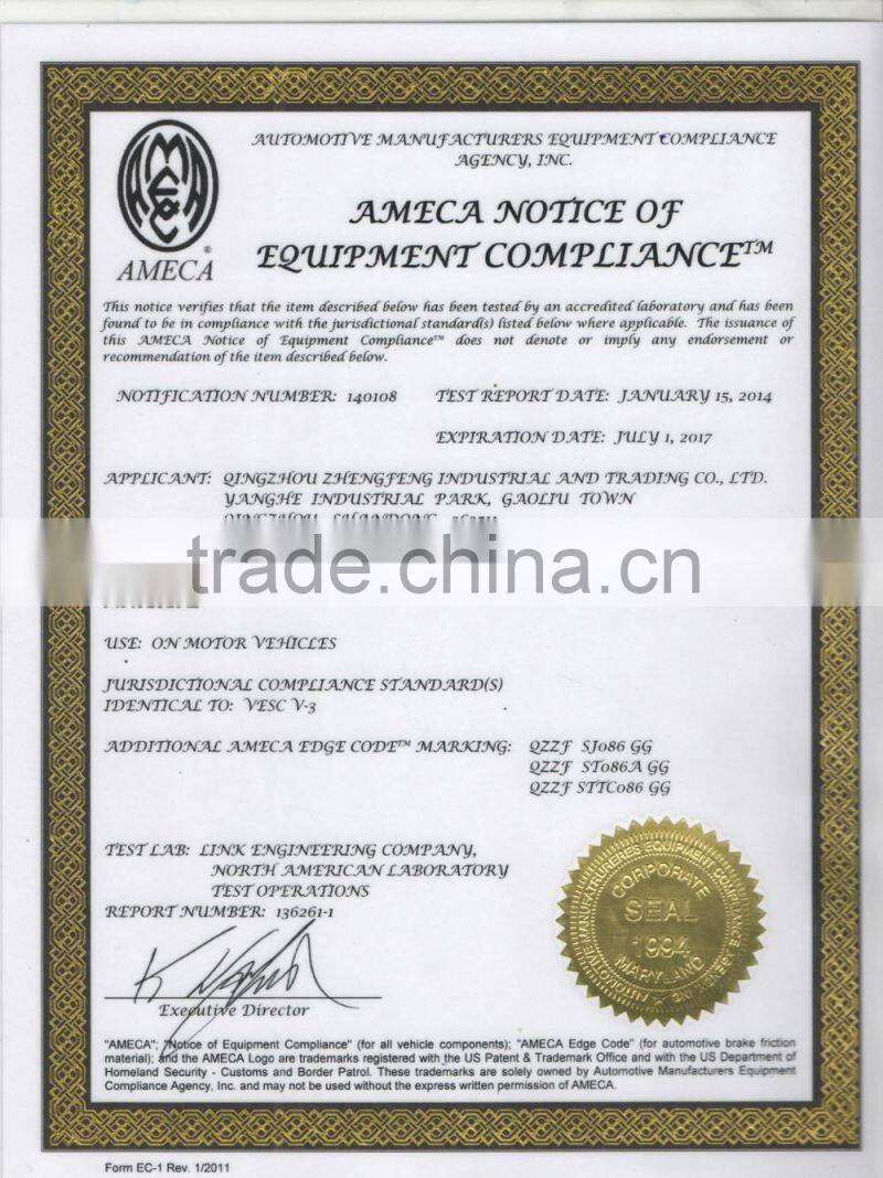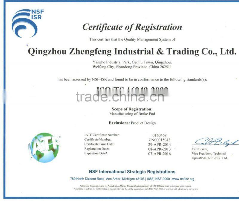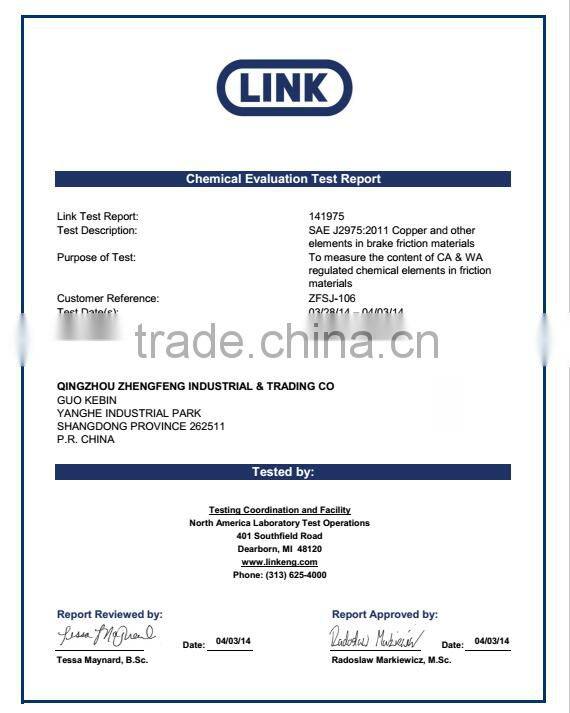 We now have three registered trademarks:Zhengfeng, Chiyuan and Aiboke.We design the tooling and make the production for all these products based on the OEM drawings.We now have four advanced formulations : low metallic, semi-metallic, low-metallic with copper and ceramic formulations .The performance of all these products is up to and even beyond the requirements of GB5763-2008 and at the same time in accordance with the standards of JISD4411,TL-110 and SAEJ66. We also passed the Vehicle Brake Inertia Test under the Link standard.We are equipped with advanced casting and machining line for gray iron and ductile iron products in accordance with standards of GB/T9439-1988,GB/T7216-1987,GB/T1348-1988,GB/T9441-1988,GB/T6414-1999 and GB1720-79.