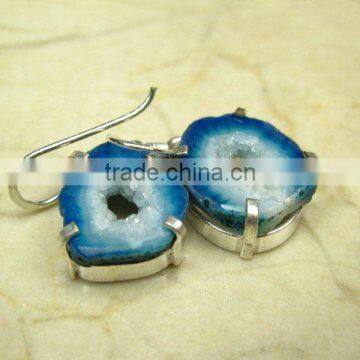 TERRIFIC BLUE DRUSY AGATE GEODE SILVER EARRINGS-1.5 IN