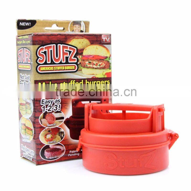 Make stuffed burgers like a pro with Stufz the stuffed burger maker. Stufz Stuffed Burger Maker as seen on TV. Make delicious, mouth watering burgers stuffed with you favorite filling, cheese, mushrooms, garlic, onions whatever you want. It’s easy as 1 shape it, 2 stuff it, 3 seal it! Stufz creates a deep cup to hold your filling, and seals the sides for a perfect leak proof burger and locking flavor in. Stufz easily pops out the burger when ready. Dishwasher safe.