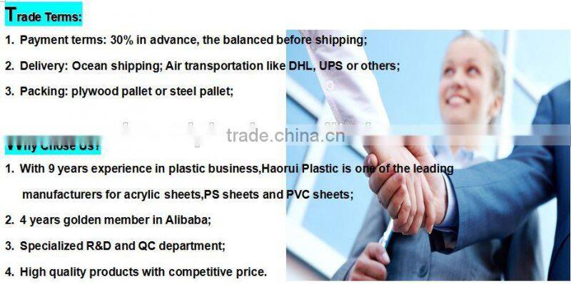 The acrylic sheet was made from the MMA monomer, which was manufactured by worldwide famous factories, after thermal treatment in high temperature drying room for 5-6 hours. It is an excellent product which complies with SGS.