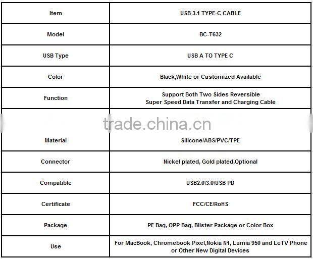 2016 New Products High Quality Type-c Cable 3.1 Usb Cable for Mac Etc